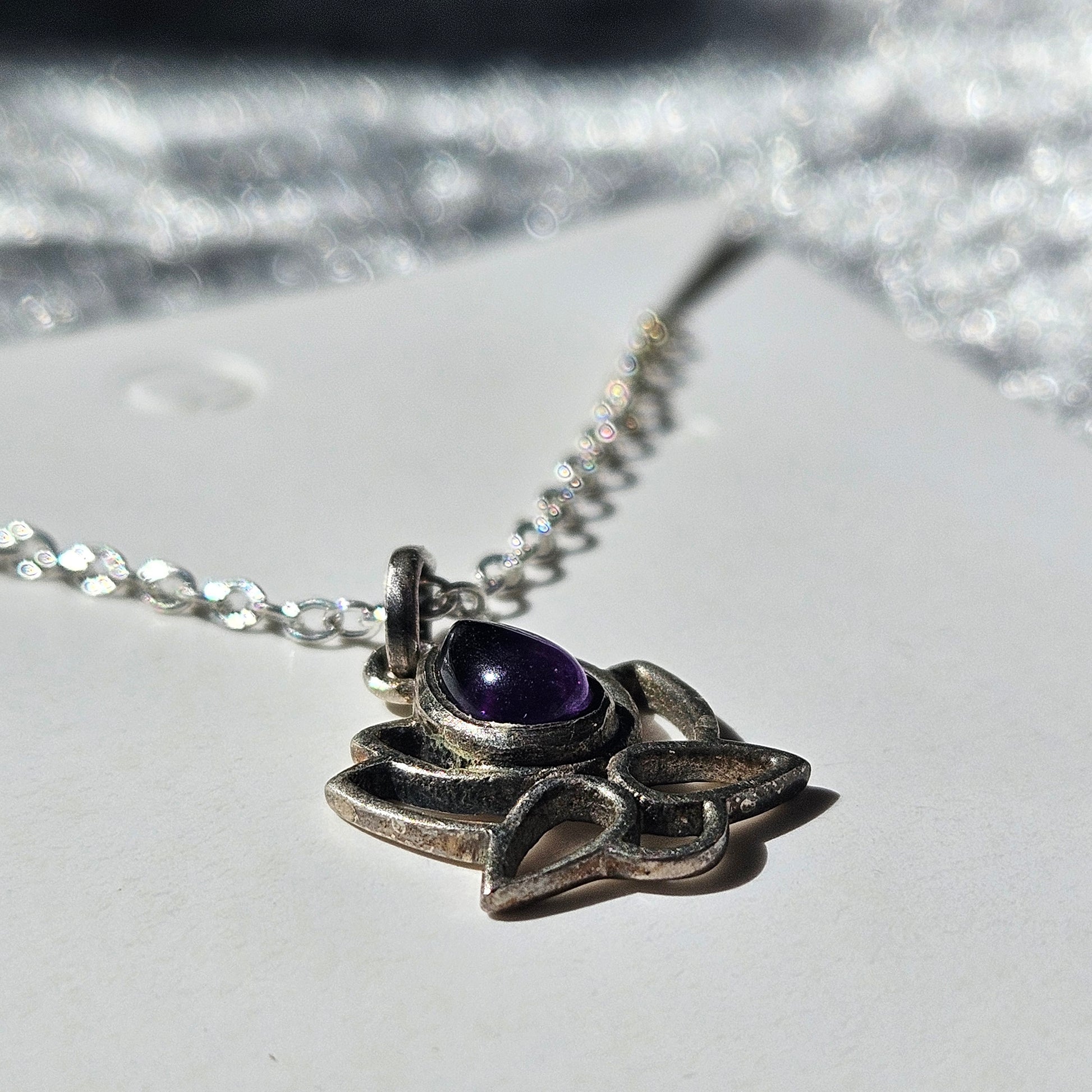 This playful necklace features a delicate lotus design crafted in sterling silver, accented by a vibrant amethyst stone. Its charming blend of elegance and colour adds a touch of whimsy to any outfit, perfect for those who love to mix beauty with a bit of fun.