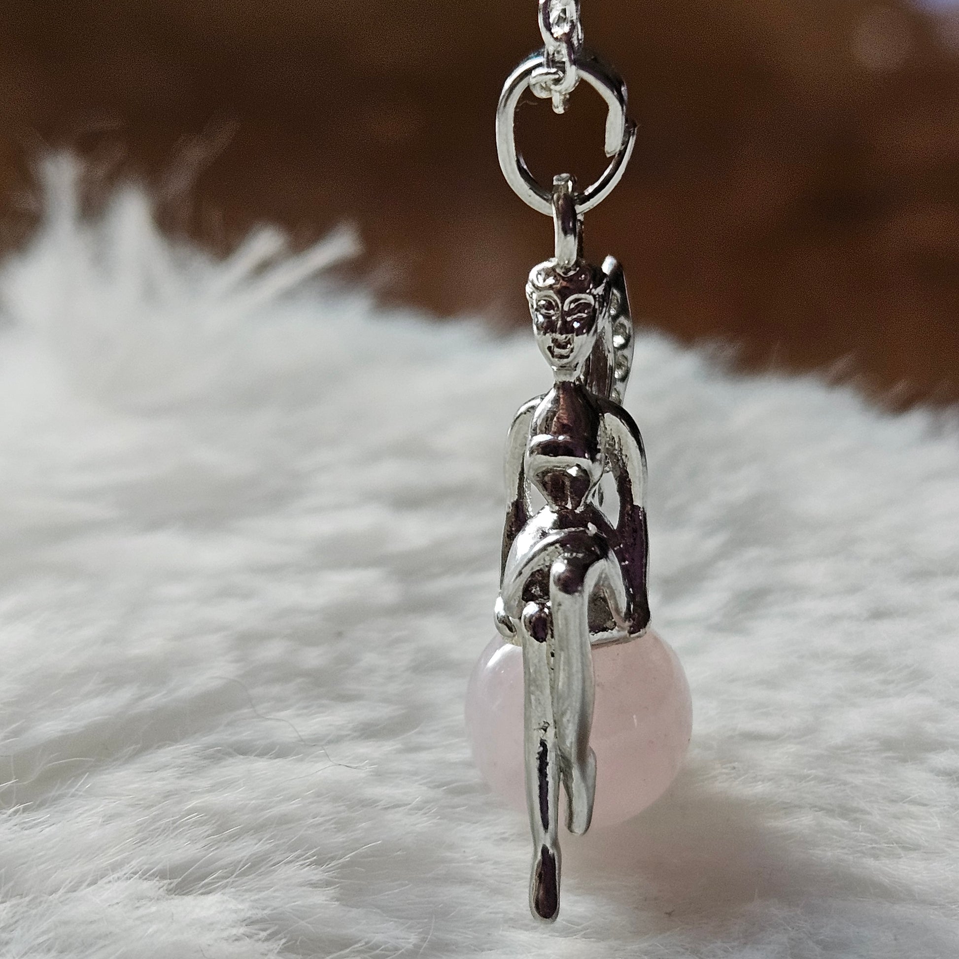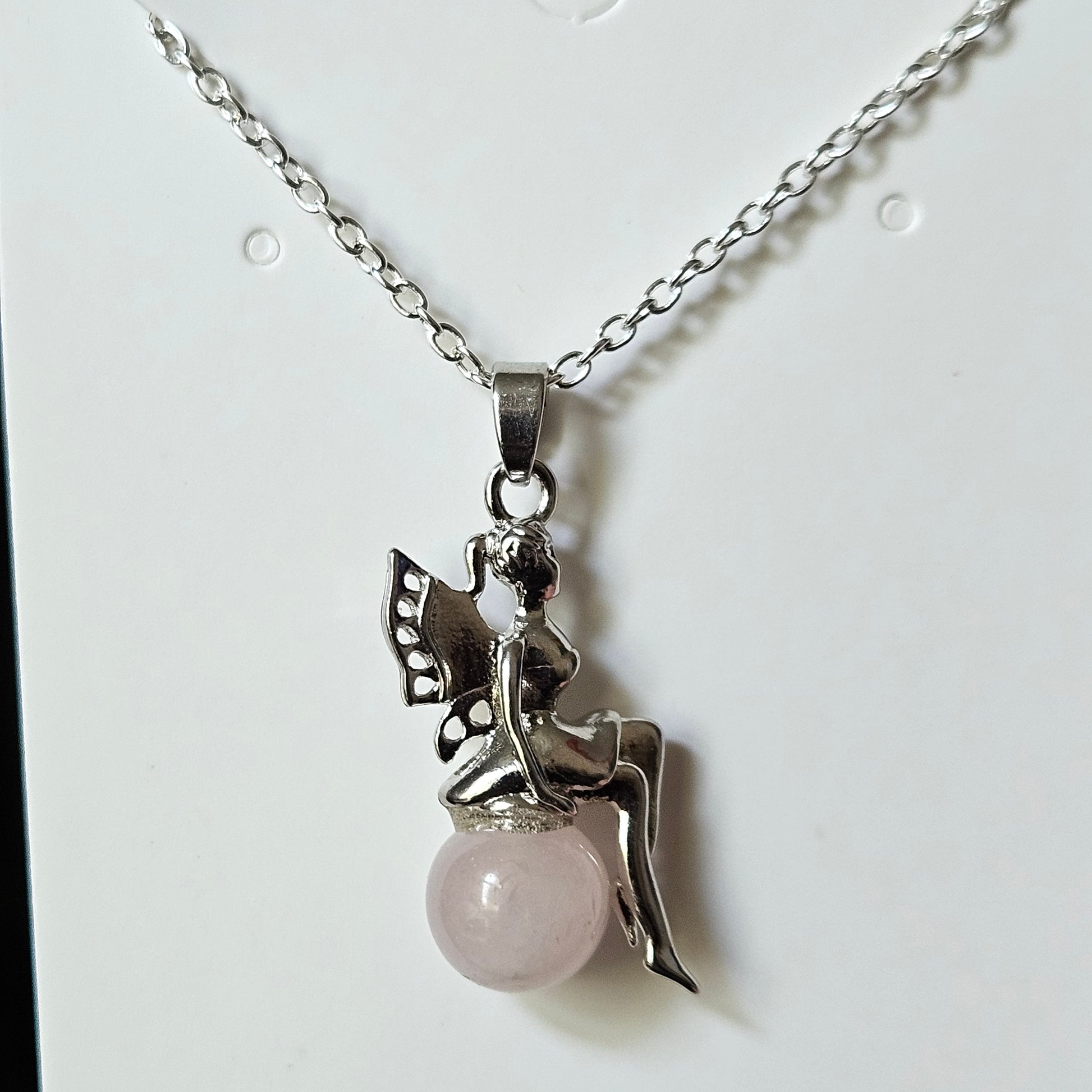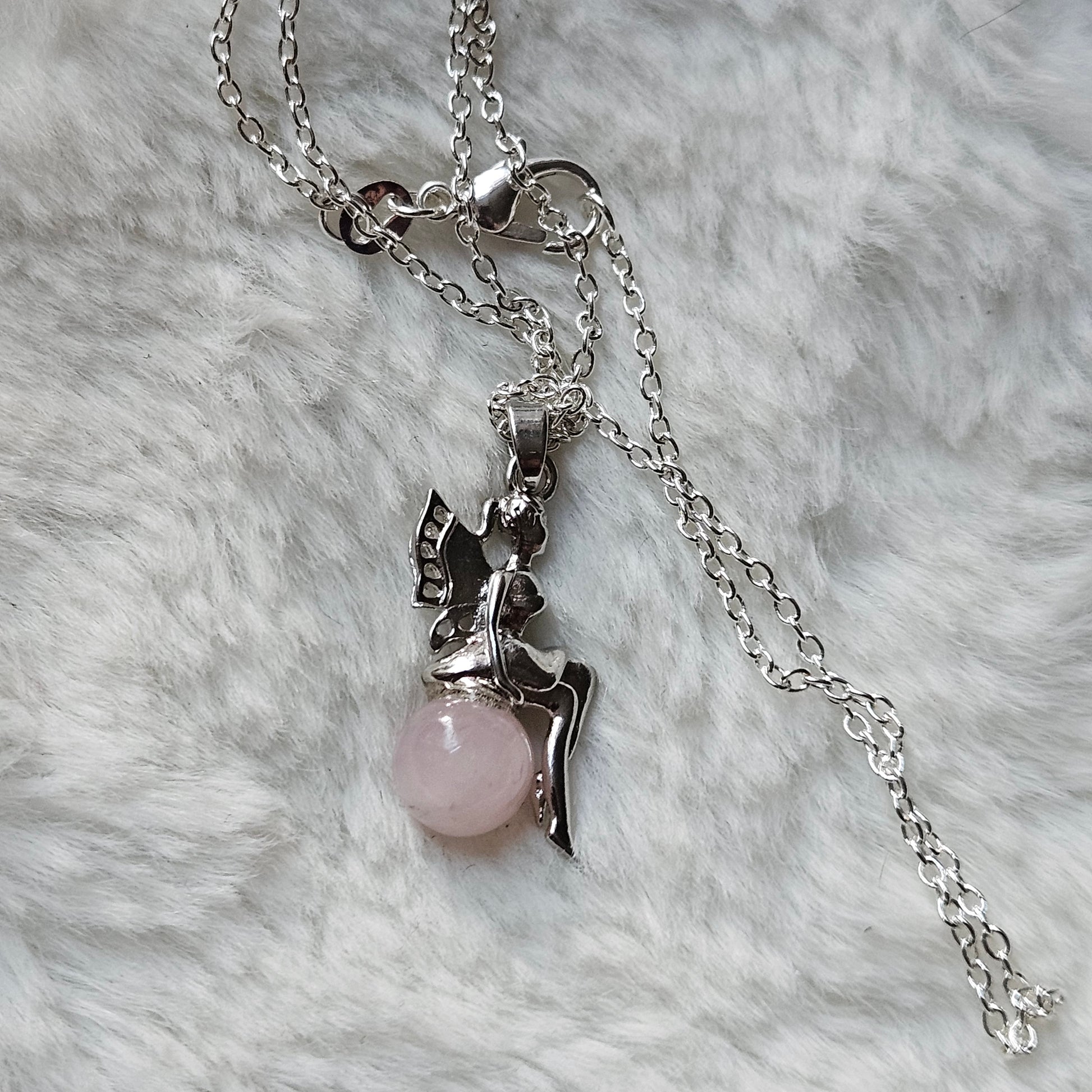 Add a little magic to your style with our Fairy Necklace! This playful accessory features a dainty fairy sitting on a beautiful rose quartz stone, bringing a touch of fantasy to your look. Made with a sterling silver chain, this necklace also offers the self love properties of rose quartz.
