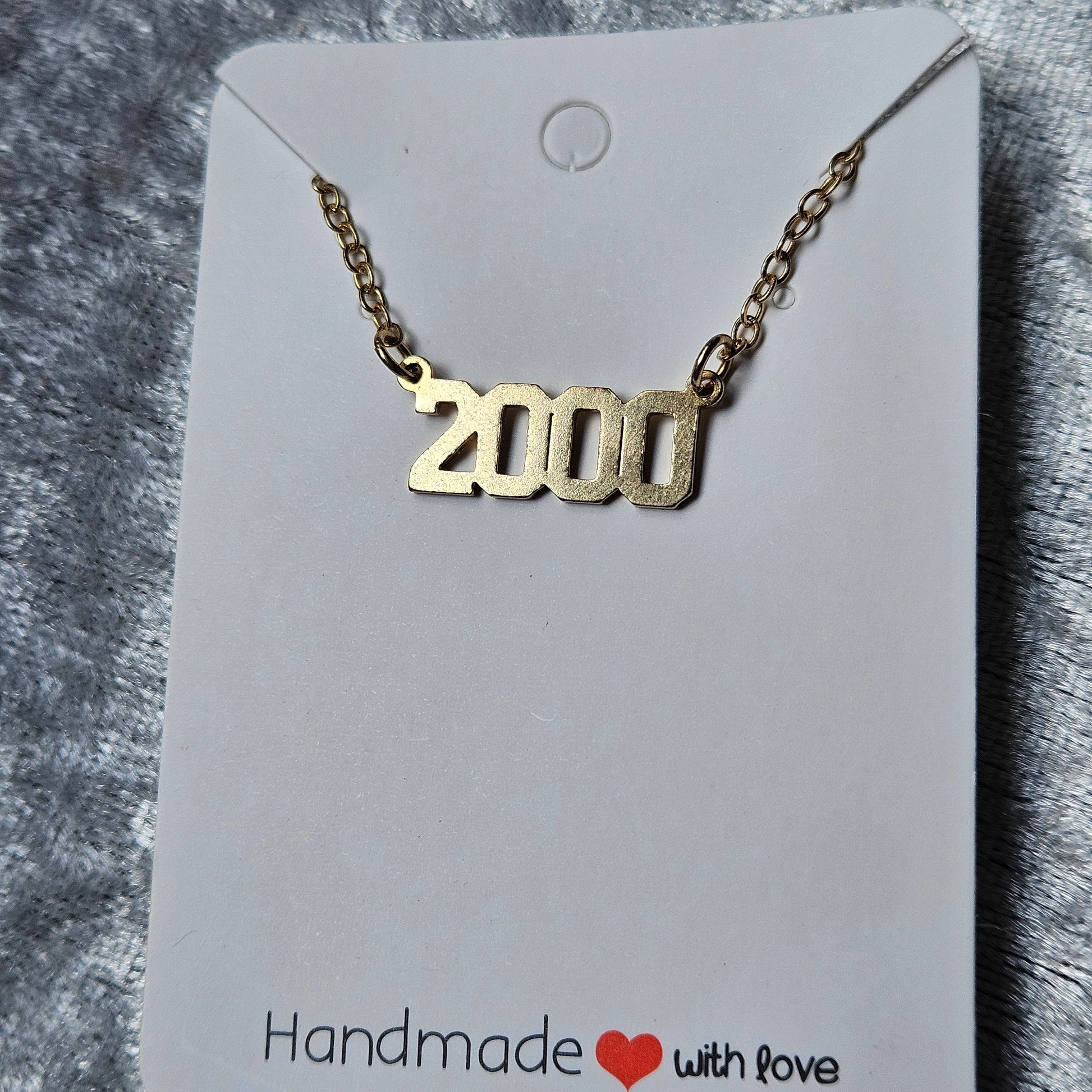 Celebrate the new millennium with a sparkling twist! This Gold '2000' Necklace adds a playful touch to any outfit, shining bright with timeless charm. Perfect for marking special moments or simply adding a dash of fun elegance to your style.