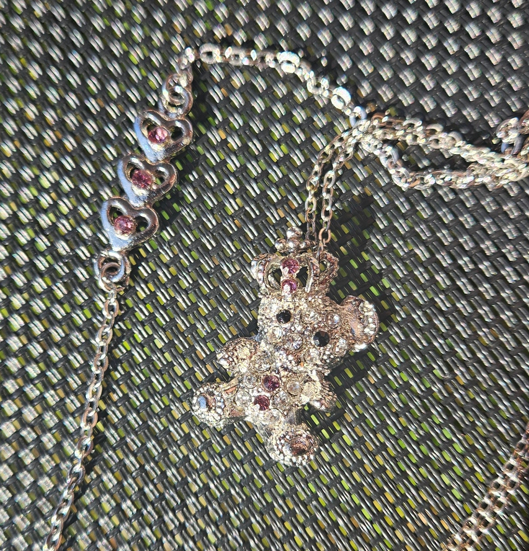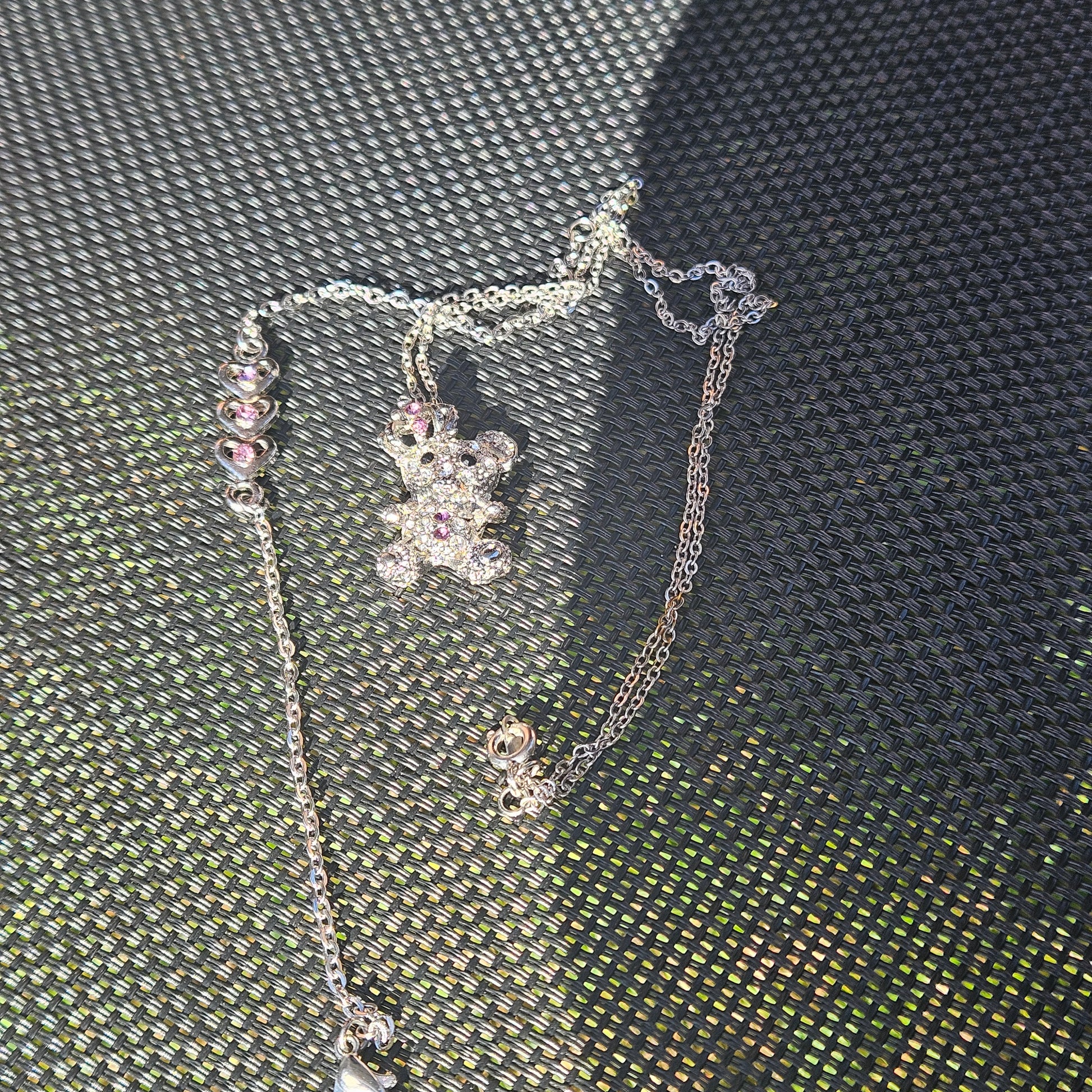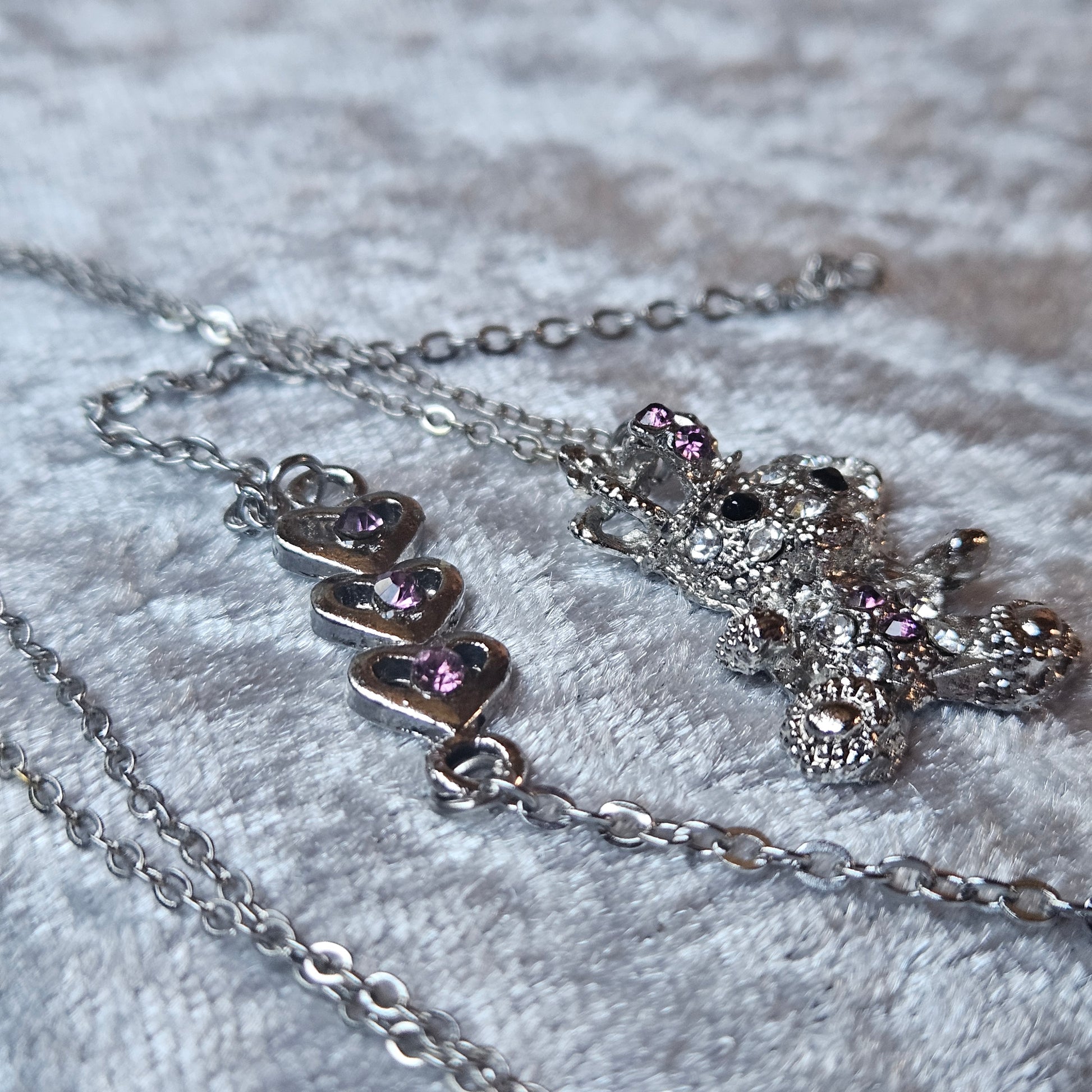 Spread the love with this darling Pink Bracelet and Necklace Set. The bracelet features charming hearts while the necklace showcases a cuddly teddy bear, making it a perfect match for anyone who loves cute and quirky accessories. Show your playful side with this fun set!
