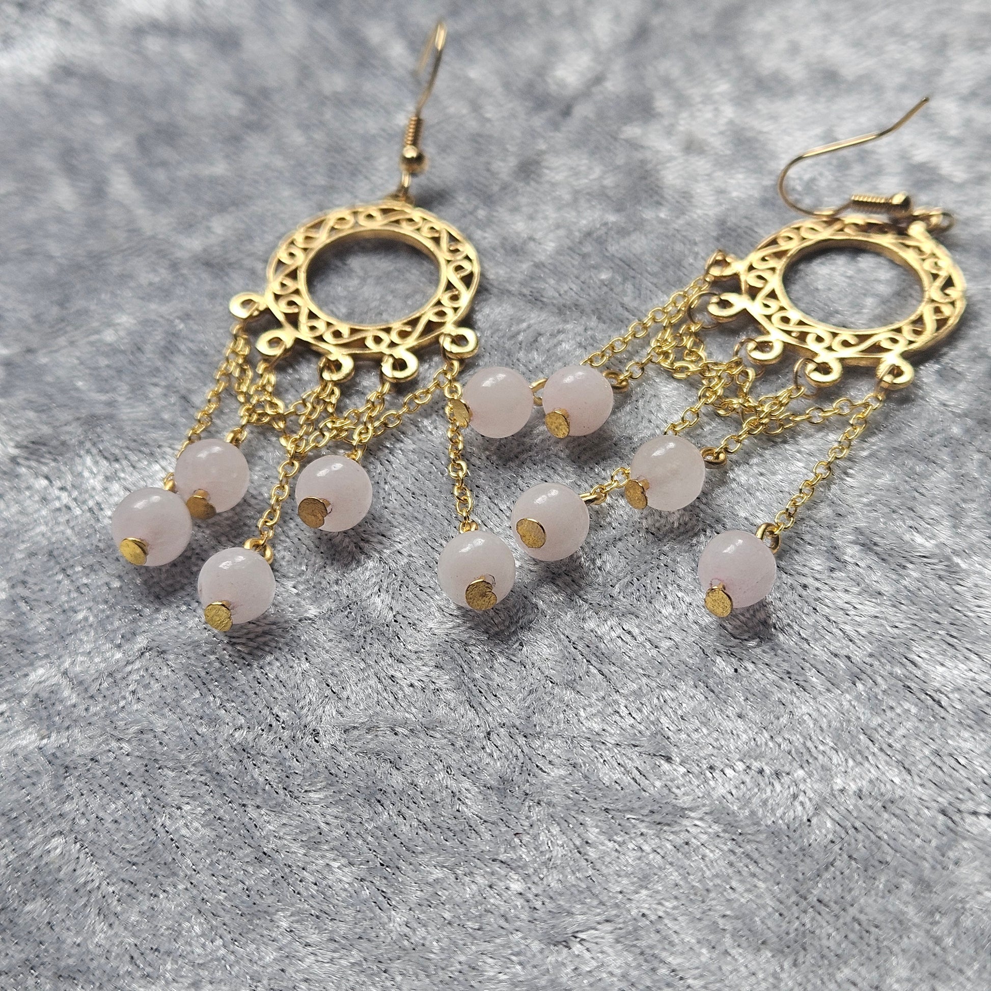 Add a splash of sparkle with these Rose Quartz Chandelier Earrings! Featuring soft pink gemstones framed in gleaming gold, they bring a dreamy glow to any outfit. Perfect for dancing through the day or lighting up the night, these earrings are your new favourite way to shine with a playful, elegant touch.