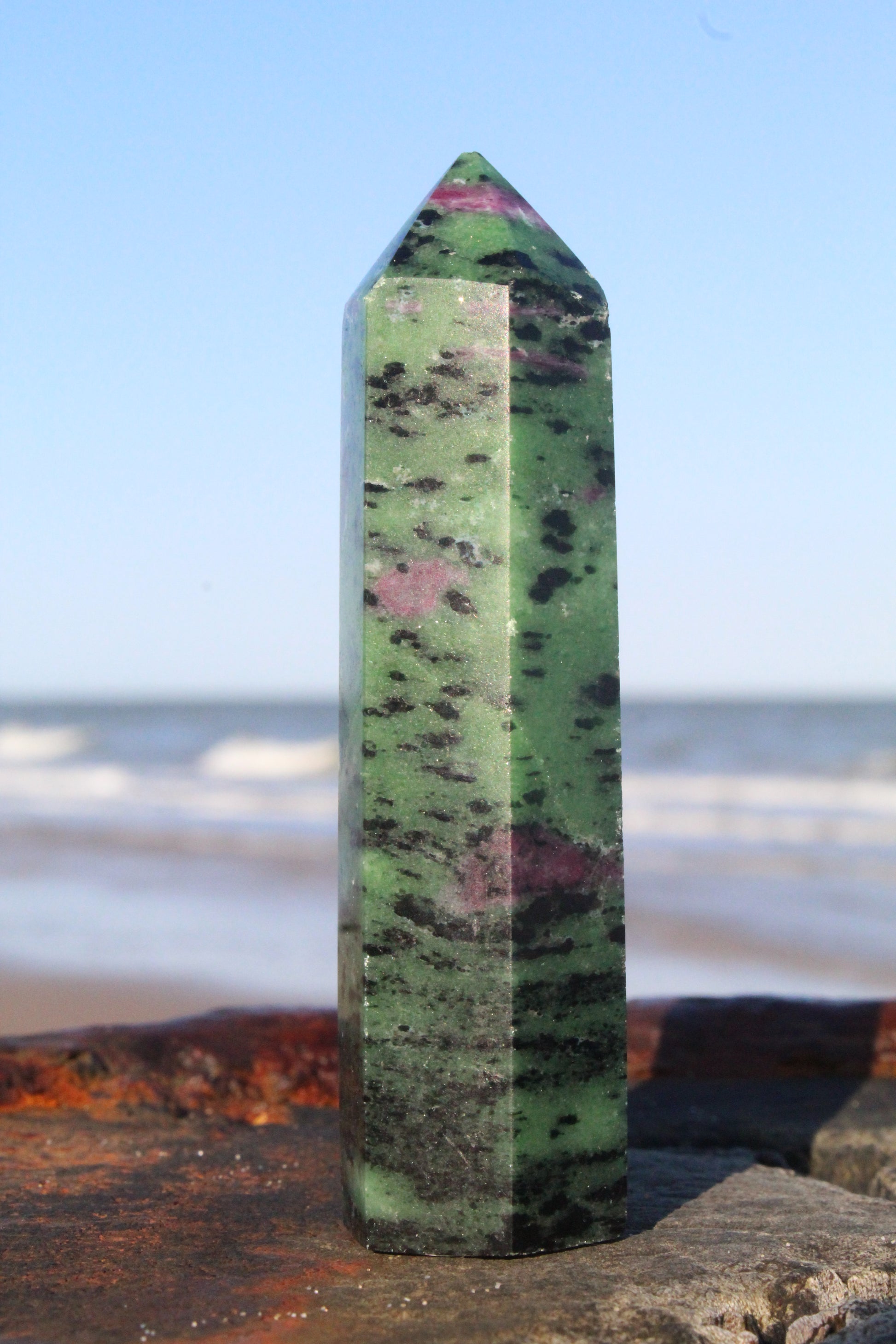 Add some gemstone magic to your home with our Ruby in Zoisite Tower! The properties of ruby in zoisite bring positive energy and harmony, making it the perfect addition to your space. Plus, it's a unique tower shape that will stand out in any room. Bring home some crystal goodness today!