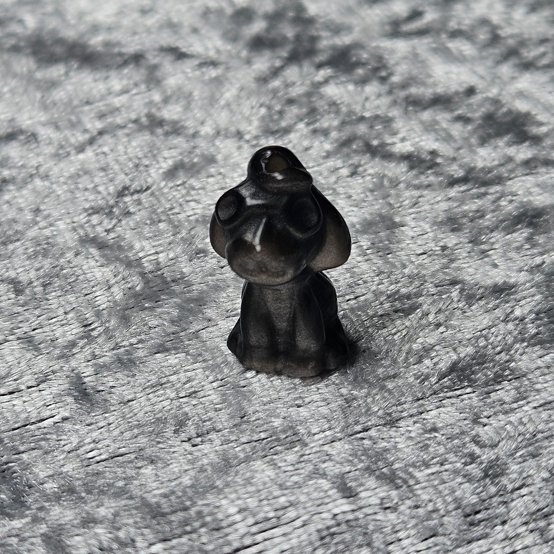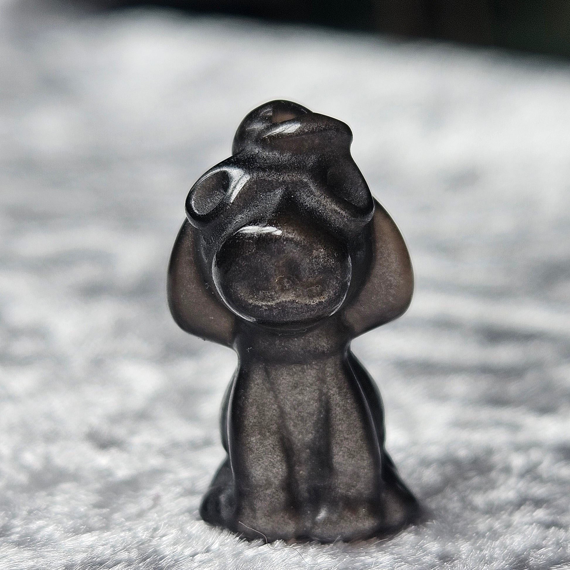 Add a touch of magic to your space with this Silver Sheen Obsidian Dog Mini Carving. Its shimmering silver highlights catch the light beautifully, while the playful dog shape brings a cheerful vibe. Perfect as a tiny talisman or a charming desk companion, this mini carving combines natural elegance with a dash of fun.