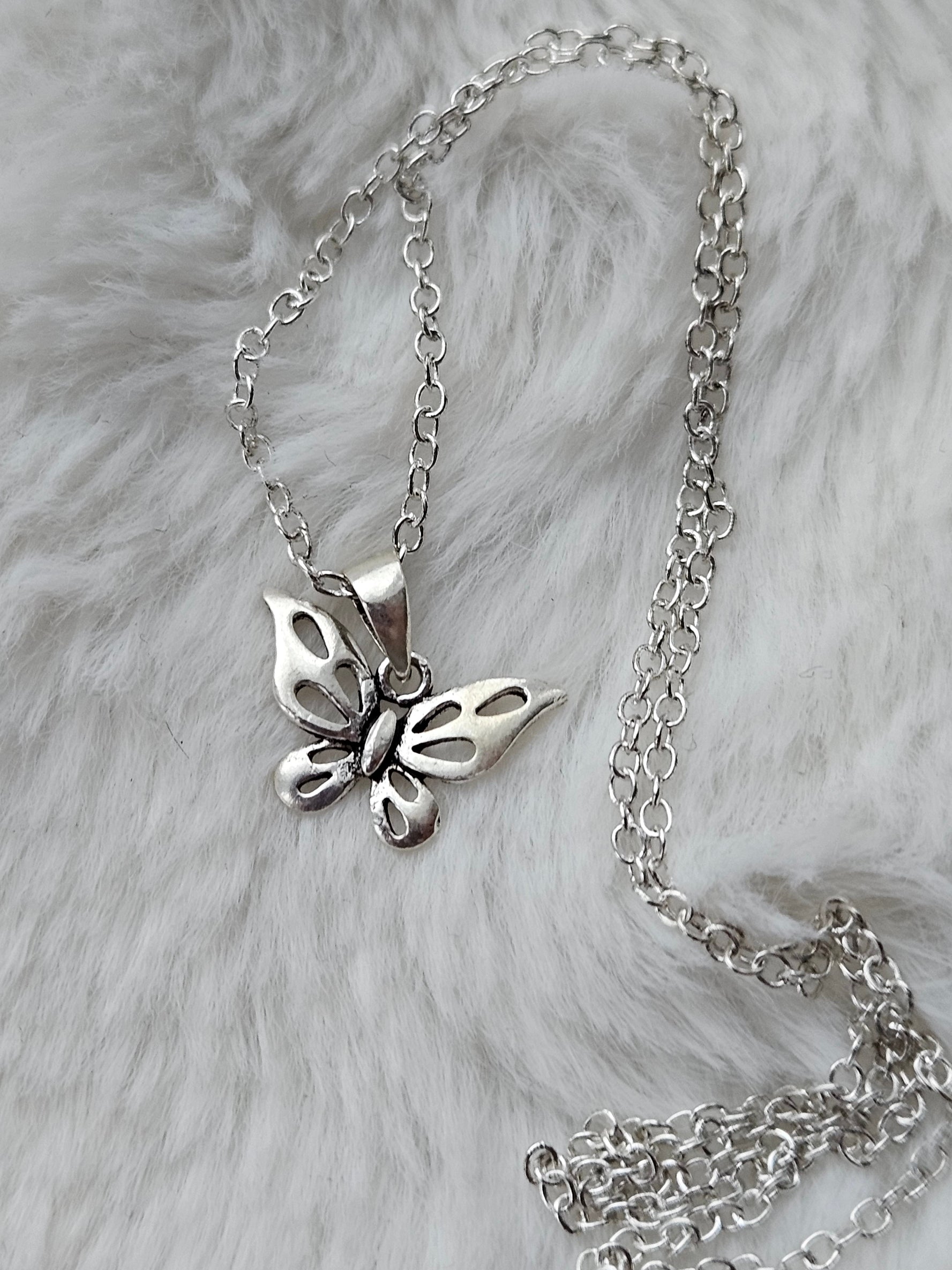 Sterling silver butterfly pendant on an 18 inch sterling silver chain.