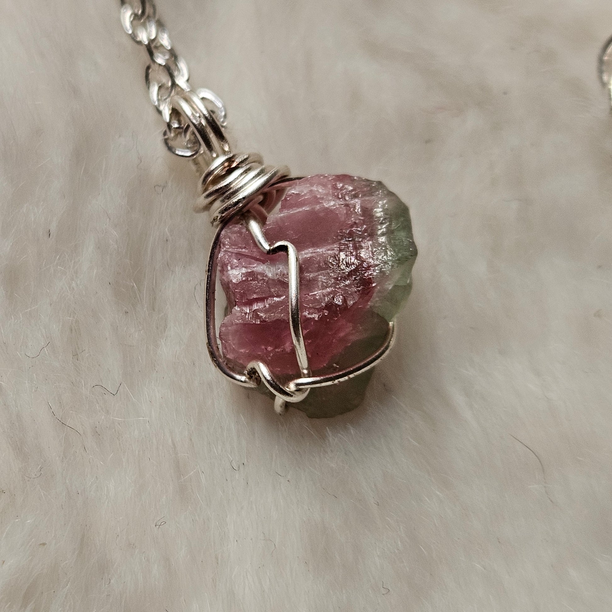 Say hello to your new favorite accessory - the Watermelon Tourmaline necklace! This gorgeous raw stone is expertly wrapped in shining silver, making it a stunning addition to any outfit. Not only does it add unique and playful flair, but its healing properties are sure to bring positive vibes to your day. Shine on!